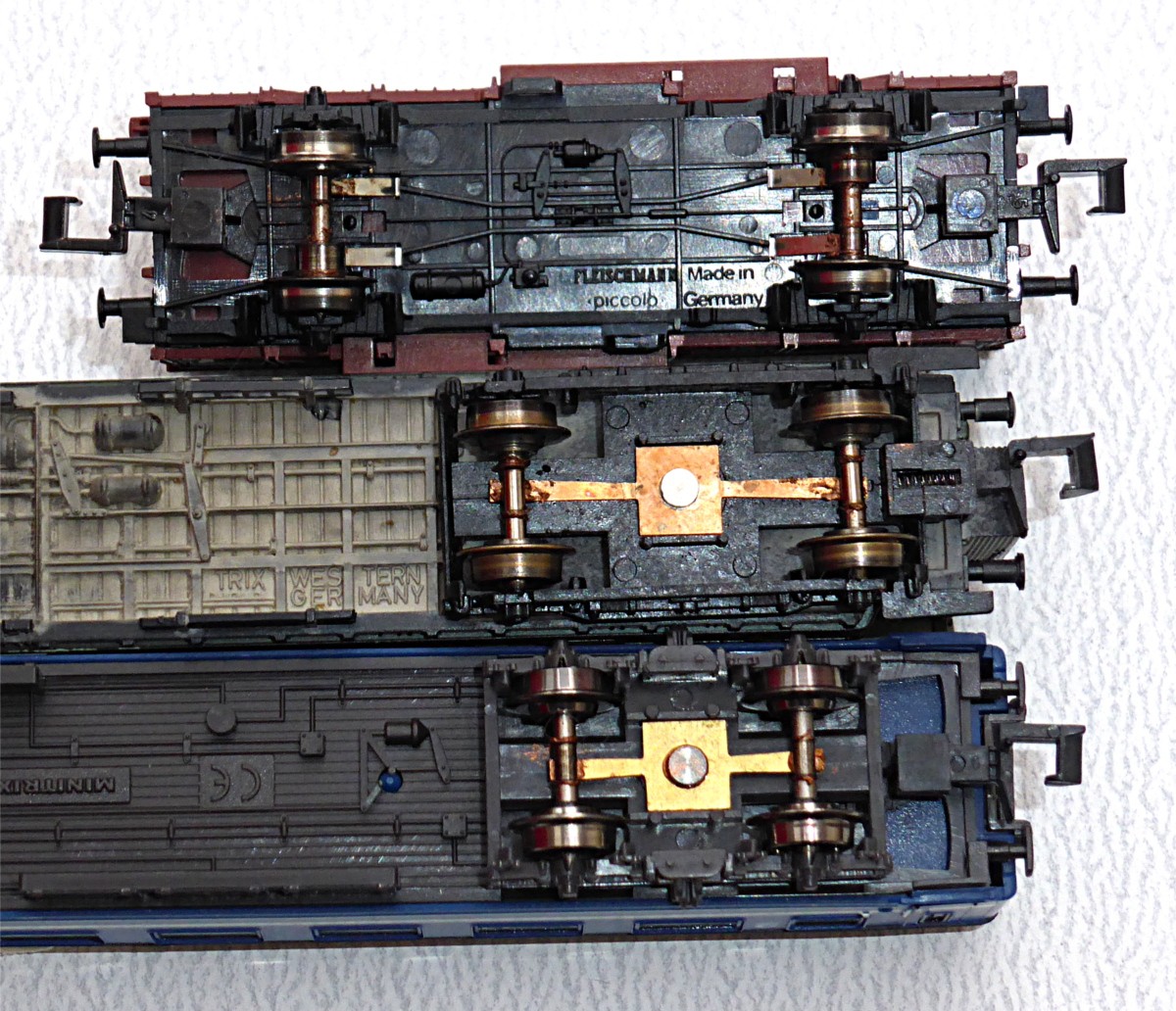 ist ein entscheidender Schritt das Auftragen einer kleinen Menge Kupferpaste (Kontaktmasse Cu) auf die Achse bzw. die Radinnenseite an der Kontaktfeder der Beleuchtung. Neben dem Vorteil des wiederum reduzierten Flackerns kann zudem der Andruck der Federn verringert werden, so dass die Wagen einen vergleichsweise leichten Lauf haben.